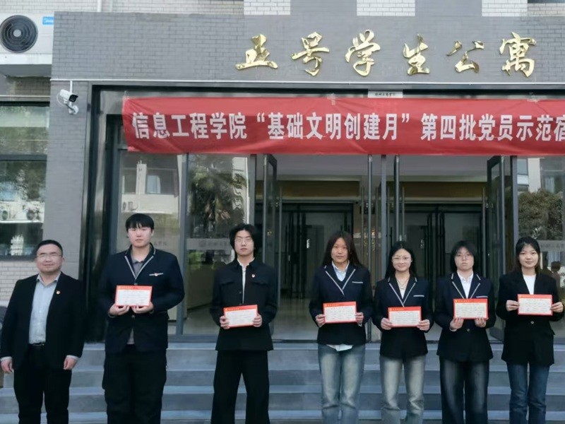 3月21日,信息工程学院在西校区4号学生公寓前组织开展学院“基础文明创建月”第四批“党员示范宿舍”创建活动。学院党总支书记、院长汪金龙,党总支副书记、团总支书记王蒙蒙、全体辅导员及党员示范宿舍宿舍长代表参加本次活动。