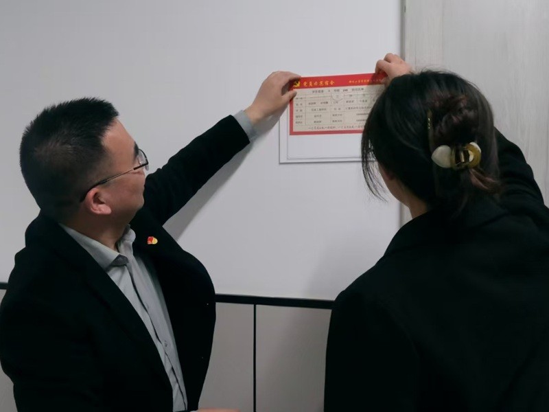 活动伊始,王蒙蒙宣读了《信息工程学院2024-2025学年第二学期“基础文明创建月”第四批党员示范宿舍创建活动方案》。随后,汪金龙宣布了获得“党员示范宿舍”的宿舍名单,并与王蒙蒙共同为“党员示范宿舍”宿舍长代表颁发象征荣誉的“党员示范宿舍”专属门卡。最后,汪金龙为这次活动做总结讲话,他表示,“党员示范宿舍”不仅是一份荣誉,更是沉甸甸的责任。希望获此殊荣的宿舍能够充分发挥先锋模范作用,以点带面,引领全院学生共同营造整洁、文明、和谐的宿舍环境。全体人员合影留念后,汪金龙和王蒙蒙到4号楼学生公寓为获评的宿舍现场悬挂“党员示范宿舍”门卡并合影留念。