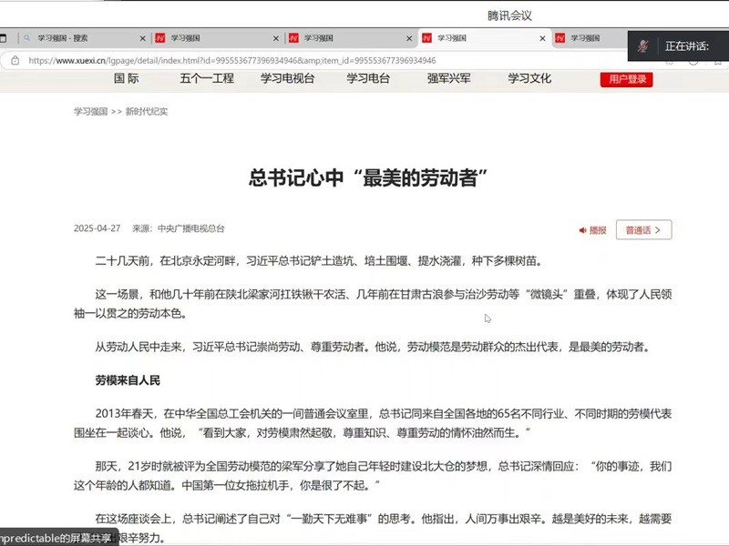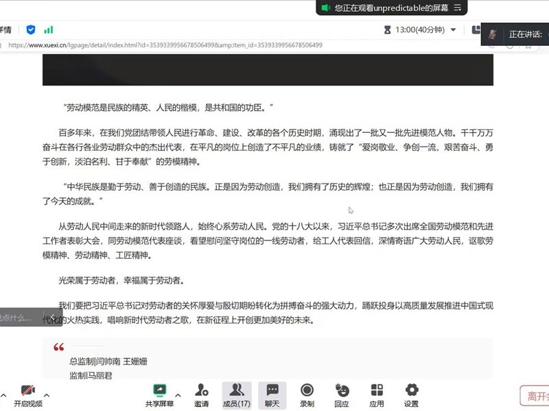 会议最后,全体与会人员云端合唱《劳动最光荣》,在激昂的歌声中坚定“以劳动筑梦,以青春报国”的信念。此次学习会不仅深化了学生对劳动价值的认知,更激发了大家以实际行动践行初心使命的热情。未来,学生党支部将持续创新学习形式,引导青年在劳动中成长,在奉献中闪光,以优异成绩迎接党的二十大精神落地生根。