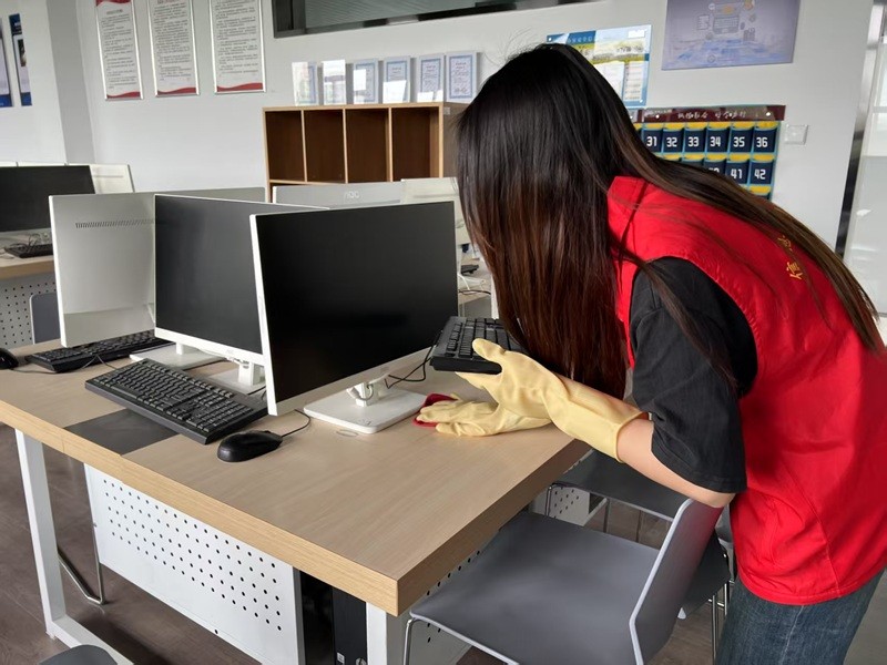 活动伊始,全体预备党员准时抵达西校区实训楼伯苓广场集合。党总支严格完成考勤工作后,将参与人员划分为设备维护、环境卫生、物品整理等专项小组,明确分工后迅速投入清洁工作。预备党员们携带清洁工具,深入各实验室,针对实训设备、操作台面、地面墙角等重点区域展开细致清洁。在计算机实验室,同学们仔细擦拭键盘鼠标,清理设备缝隙积尘;在电子实训区,大家规范整理线路、校准仪器摆放位置。劳动过程中,预备党员们充分展现出不怕苦、不怕累的精神风貌,以高度的责任感认真完成每项任务。