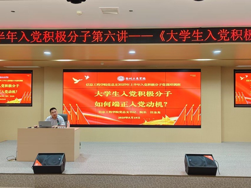 5月19日,信息工程学院党总支在三号教学楼怀德讲堂组织开展2025年上半年入党积极分子培训第六讲,主题为《大学生入党积极分子如何端正入党动机》。入党积极分子培训班全体成员参加。本次培训由党总支书记,院长汪金龙主讲。