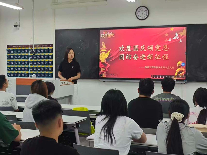 9月29日,信息工程学院学生第八党支部在一号教学楼318开展“欢度国庆颂党恩,团结奋进新征程”主题党日活动。本次活动由支部书记涂静娜主持,支部全体成员参加。