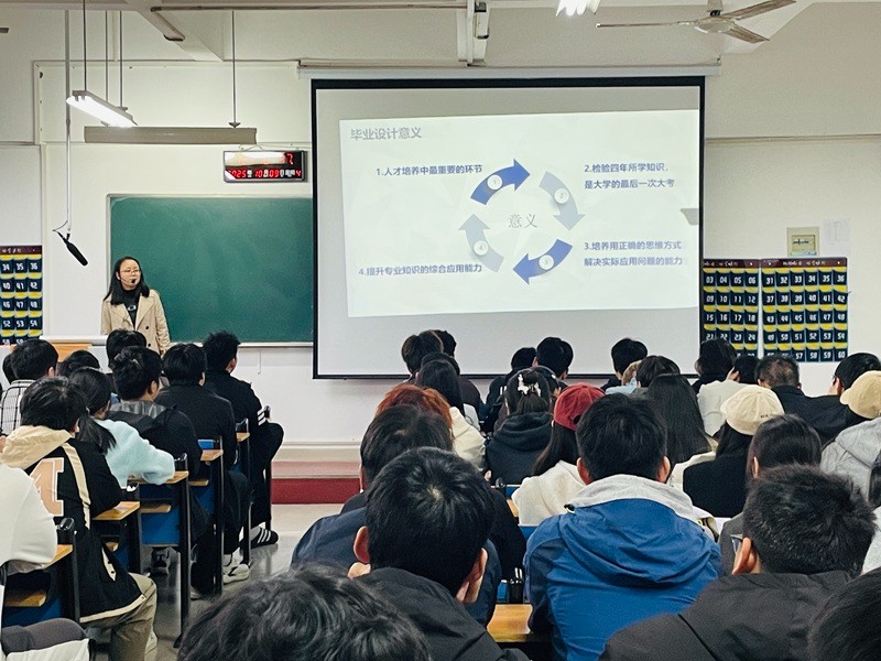 会议伊始,袁亚哲与王璐都强调毕业设计的重要性,指出其不仅是对学生专业知识掌握程度的全面检验,更是为未来职业发展奠定坚实基础的关键环节。随后,她们详细阐述毕业设计的选题原则,鼓励学生结合个人兴趣与行业发展趋势进行选题,勇于创新,展现个人风采。最后,她们还全面细致地讲解毕业设计及毕业实习的相关要求与注意事项,分享选题方法以及高质量文档的撰写技巧,为同学们指明努力的方向。