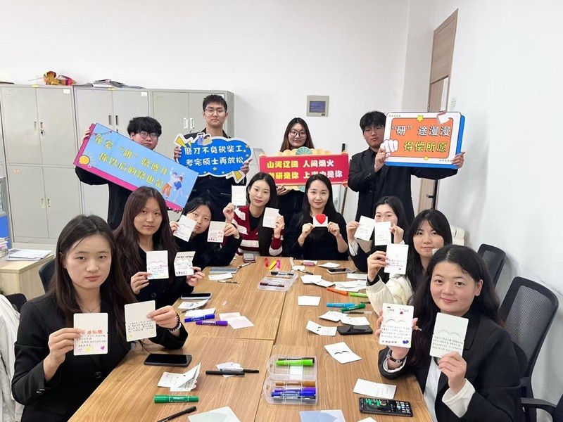 活动伊始,支部成员们围坐于桌前,手持彩色卡片,认真书写对考研学子的鼓励话语。“以梦为马,不负韶华”“考研是一场孤独的修行,但坚持下去,曙光就在前方”等话语,表达出成员们对考研学子的诚挚期许。随后,成员们带着精心制作的祝福卡片,前往考研学子复习的教室,将卡片逐一送到他们手中。收到卡片的考研学子们深受触动,纷纷表示这些祝福让他们在紧张的备考过程中感受到关怀与力量。最后,成员们与考研学子共同合影留念,为此次活动画上圆满句号。