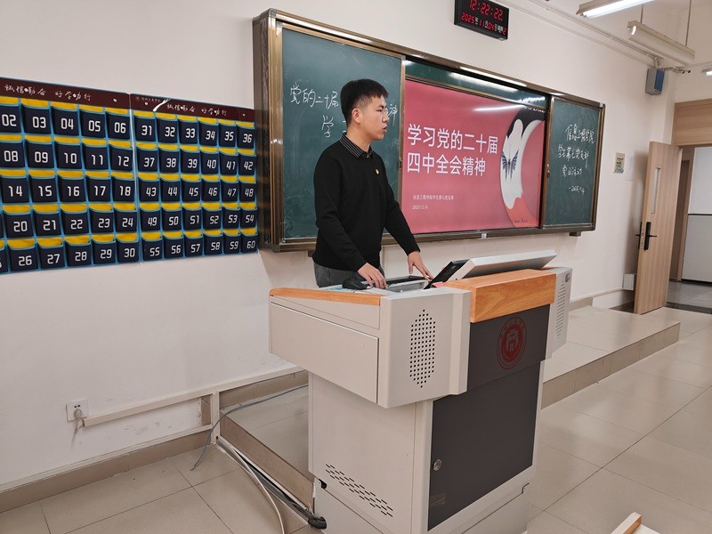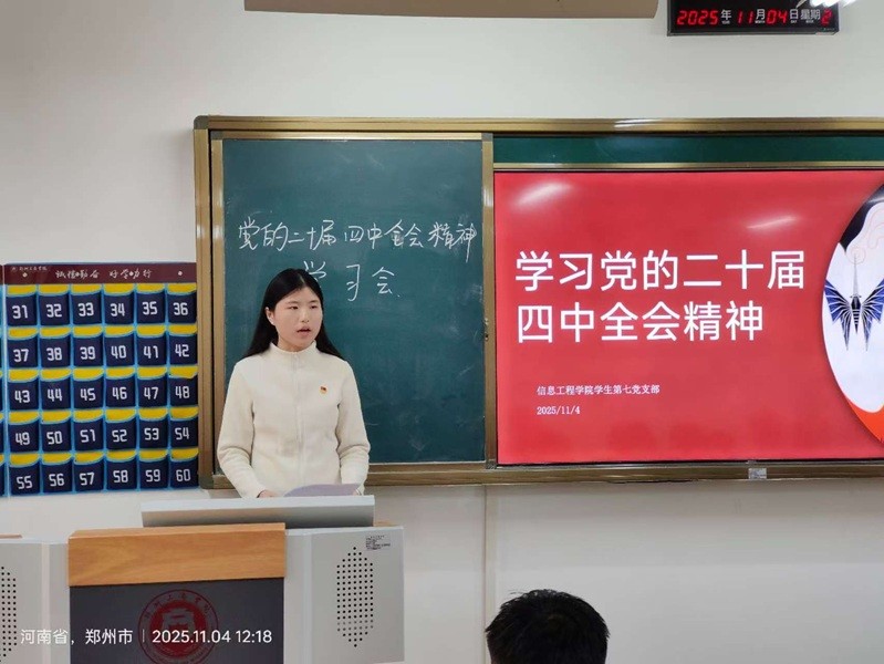 11月4日,信息工程学院学生第七党支部在一号教学楼313教室开展“党的二十届四中全会精神”主题学习会。组织委员王珂,宣传委员马博文及支部全体成员参加,会议由支部书记王盛主持。
